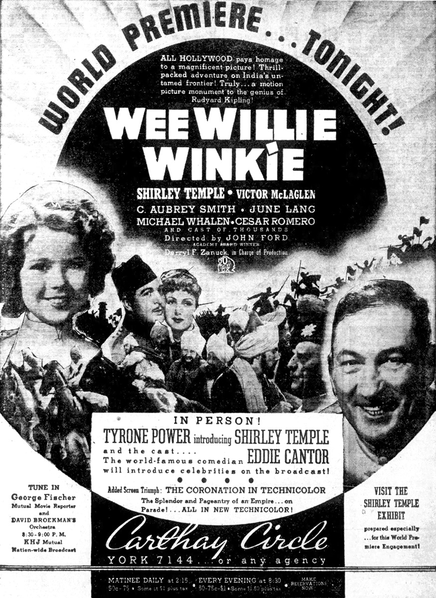 Last night a long stream of expensive cars drove slowly through traffic-laden streets, drew up one by one at Carthay Circle, and delivered a collection of motion picture celebrities who filed through mouth-agape onlookers into the theater where the film had its first screening The usual formalities were observed, with the introduction of cast and officials by Tyrone Power, acting as master of ceremonies. Shirley Temple, who with Victor McLaglen shares honors in the picture, made her first appearance on the stage of any theater. “Wee Willie Winkie” unless everybody’s guess is wrong, will shower both gold and glory upon Twentieth Cetury-Fox. Box office response should be tremendous not only from Shirley Temple’s admirers, but also from the non-Temple fans who are bound to find out that “Wee Willie Winkie” is something more than a “Shirley Temple picture.” In every department—from its script to final editing—the film is definitely Class A, which means that its director, Mr. John Ford, may regard it as a personal triumph.